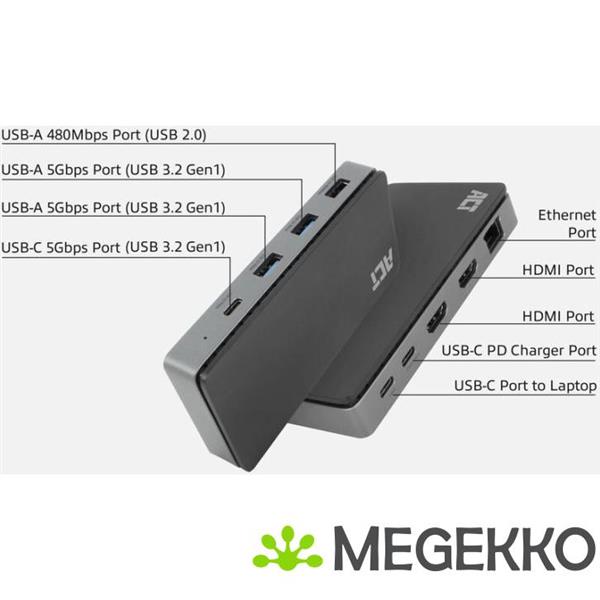 8-in-1 | 2x 4K@60Hz HDMI-monitor | MST | 100W PD passthrough | 1x USB-C | 3x USB-A | Gigabit LAN | afneembare aansluitkabel van 1 meter Verander je Windows-laptop in een volwaardig werkstation met het AC7093 dockingstation. Met de afneembare USB-C-kabel van 1 meter sluit je eenvoudig tot twee 4K-monitoren aan dankzij de ondersteuning van Multi-Stream Transport (MST). Daarnaast kun je toegang krijgen tot snel internet via de Gigabit LAN-poort en je connectiviteit uitbreiden met meerdere USB-poorten. Of je nu op kantoor bent, thuis werkt of onderweg bent, de AC7093 biedt de veelzijdigheid en het gemak die je nodig hebt. Met het compacte en reisvriendelijke ontwerp creëer je een productieve en georganiseerde werkplek, waar je ook werkt. Verander je Windows-laptop in een compleet werkstation met één USB-C-kabel Het AC7093-dockingstation biedt je het complete pakket. Verander je laptop in een volwaardig werkstation door een enkele USB-C-kabel op je laptop aan te sluiten. Verbind tot twee 4K-monitoren (maximale resolutie 4096x2160p @ 60Hz) met je laptop via de HDMI-poorten met DP Alt Mode versie 1.4. Het dockingstation is uitgerust met een Gigabit LAN-netwerkpoort, één USB-C-poort (5Gbps), twee USB-A-poorten (5Gbps) en één USB-A 2.0-poort (480Mbps). Breid uit naar twee 4K HDMI-monitoren met MST-ondersteuning De AC7093 ondersteunt Multi-Stream Transport (MST), waardoor je je bureaublad kunt uitbreiden met twee HDMI-monitoren. Ondersteunt de USB-C-poort van je laptop DP Alt Mode versie 1.4? Dan ondersteunt de dual monitor setup twee monitoren met een maximale resolutie tot 4K@60Hz per monitor. Als je laptop is uitgerust met DP Alternate Mode versie 1.2, ondersteunt de dual monitor setup één 4K@30Hz-monitor en één 1080p@60Hz-monitor. Laad je laptop op met maximaal 100W via het dockingstation Het dockingstation heeft een Power Delivery passthrough-poort die maximaal 100W kan leveren. Sluit de USB-C-lader van de laptop aan op de PD passthrough-poort van de dock en de laptop zal via het docking station worden opgeladen. Houd er rekening mee dat er geen oplader wordt meegeleverd. Deze is alleen nodig wanneer de laptop via de USB-C-poort wordt opgeladen. Afneembare USB-C-kabel inbegrepen Het dock wordt geleverd met een afneembare USB-C naar USB-C-kabel van 1 meter. Dit maakt het gemakkelijk om het dock op je laptop aan te sluiten. We raden aan om de meegeleverde USB-C-kabel te gebruiken. Als je de kabel kwijtraakt, koop dan een nieuwe kabel met ten minste de volgende specificaties: 5Gbps en 100W Power Delivery. De USB-C-kabel mag maximaal 1 meter lang zijn. USB-poorten De USB-C-poort is een USB 3.2 Gen1 datapoort met een maximale doorvoersnelheid van 5Gbps. Twee USB-A-poorten zijn USB 3.2 Gen1 datapoorten met een maximale doorvoersnelheid van 5Gbps. Eén USB-A-poort is een USB 2.0 datapoort met een maximale doorvoersnelheid van 480Mbps. Sluit USB-randapparatuur aan zoals een toetsenbord, muis en externe opslag zoals een SSD. Werk je op meerdere locaties of ben je veel op reis voor je werk? De AC7093 is ideaal voor werken op meerdere locaties. Dankzij het compacte formaat en de directe compatibiliteit is het eenvoudig om monitoren en het bekabelde LAN-netwerk aan te sluiten. Het dockingstation is ideaal om mee te nemen in je tas wanneer je voor je werk reist. Het heeft een lichtgewicht ontwerp en een afneem