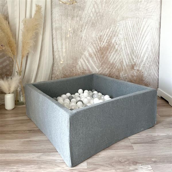 Groot vierkant ballenbad van 106x106x40 cm, gemaakt van dik schuim en velvet katoen. Ideaal voor 2-3 kinderen vanaf 6 maanden. Stevig, veilig, wasbaar en perfect voor spel, motorische ontwikkeling en interieur. Gemaakt in Europa.