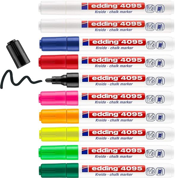 Voor duidelijk schrift en normale lijnen tekeningen met krijt is de edding 4095 krijtmarker ongetwijfeld de perfecte keuze. Uit de fijne ronde punt stroomt sterk dekkend vloeibaar krijt, waarmee zelfs op kleinere oppervlakken betrouwbaar geschreven en gemarkeerd kan worden. Hij is verkrijgbaar in 20 kleuren en biedt een talloze mogelijkheden om creatief te werken op gladde oppervlakken zoals schoolborden, spiegels en glas. Deze marker van edding is niet alleen geschikt voor creatief werk thuis, maar ook een favoriet hulpmiddel voor restaurants, bars en de glasindustrie.