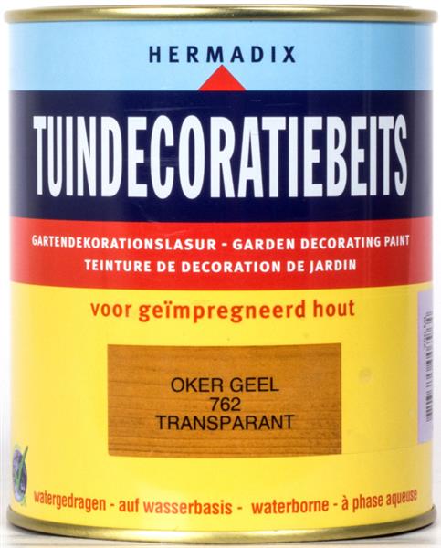 Hermadix Tuindecoratiebeits is speciaal ontwikkeld voor nieuw en oud geïmpregneerd tuinhout zoals: schuttingen, speeltoestellen, borders, pergola, vlonders en geïmpregneerde blokhutten.  Nieuw geïmpregneerd tuinhout heeft een fabrieksmatige behandeling ondergaan. De speciale samenstelling van Tuindecoratiebeits is naadloos afgestemd op deze behandeling. Hierdoor kunt u uw tuinhout makkelijke en snel beitsen. Bij onderhoudslagen hoeft niet geschuurd te worden.  Oker geel is een transparante kleur en geeft een natuurlijke uitstraling waarbij de houtnerf zichtbaar blijft. Tuindecoratiebeits is makkelijk te verwerken en geeft een jarenlange bescherming en sfeervolle uitstraling. Een Environment o.k. product dus, mens- en milieuvriendelijk.